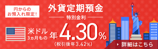 - 期間中であっても、円定期預金の預入額が一定額に達した場合にはキャンペーンを終了する場合があります。また、金融情勢の変化等により金利水準やキャンペーン期間の見直しをさせていただく場合があります。最新の金利は当社WEBサイトにてご確認ください。