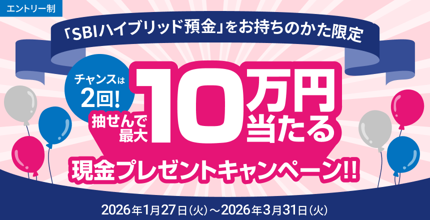 住信SBIネット銀行株式会社(本社:東京都港区、代表取締役(CEO):円山法昭、以下「住信SBIネット銀行」)は、1月27日(火)より「チャンスは2回!抽せんで最大10万円当たる現金プレゼントキャンペーン」を実施いたします。