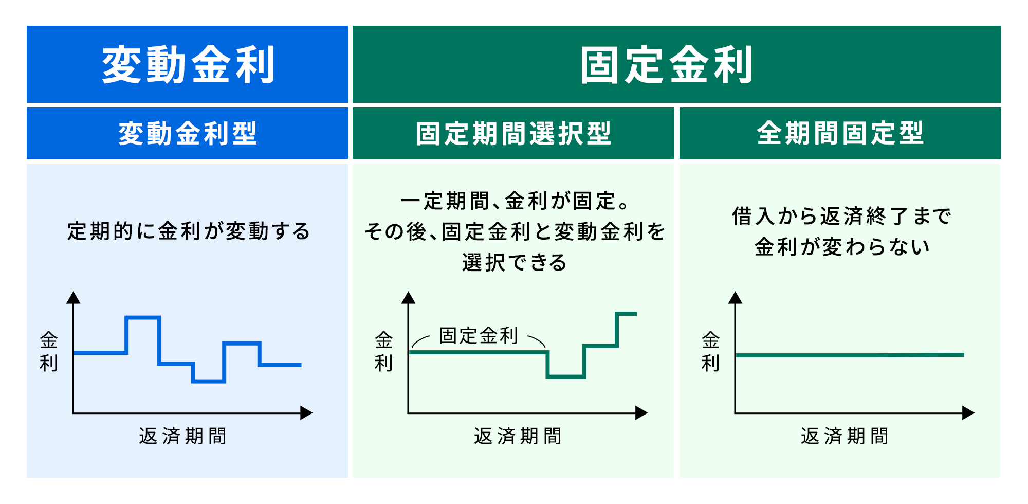 住宅ローンの金利タイプには、変動金利、固定金利の2種類があります。固定金利は固定期間選択型、全期間固定型の2つに分けられます。