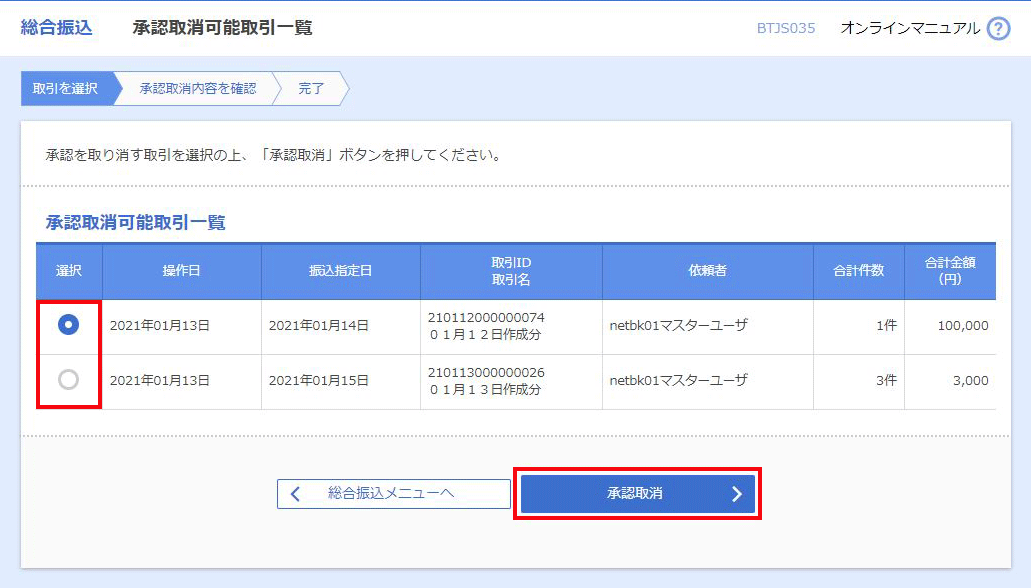 対象の取引を選択し、[承認取消]ボタンをクリックしてください。