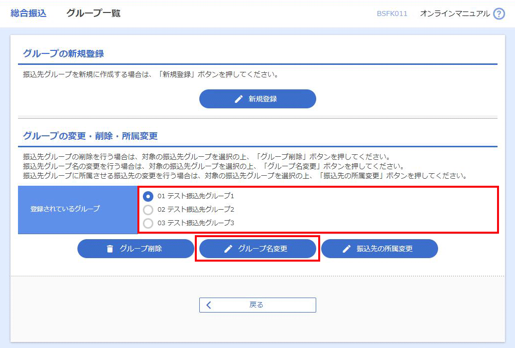 登録されているグループからグループ名を選択し、[グループ名変更]ボタンをクリックしてください。